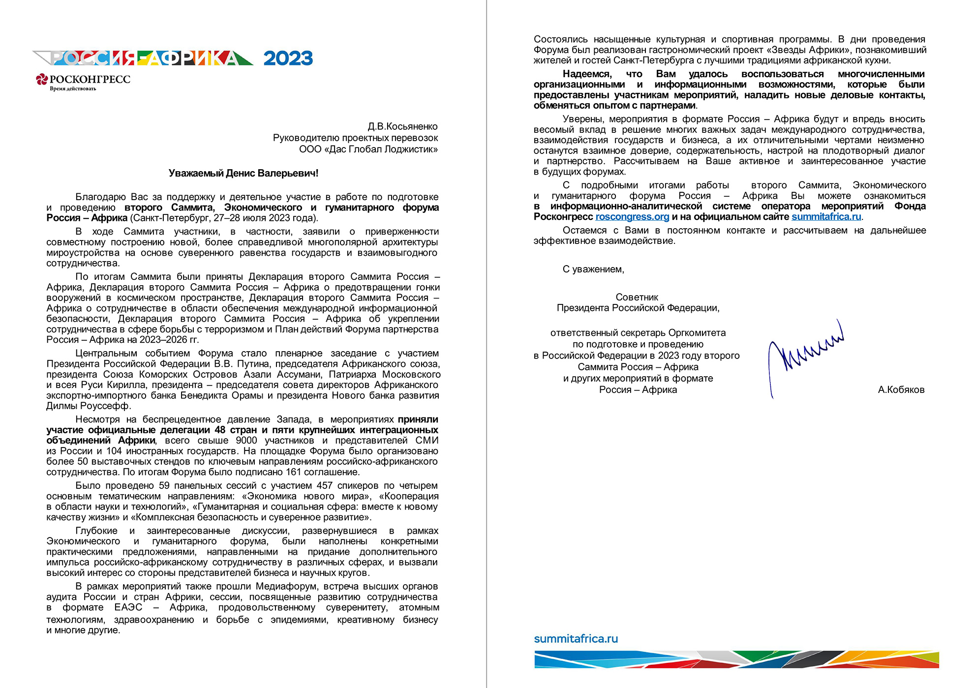 DAS GLOBAL LOGISTIK received a letter of thanks from the Roscongress Foundation as part of its participation in the Second International Summit, the Russia-Africa Economic and Humanitarian Forum.