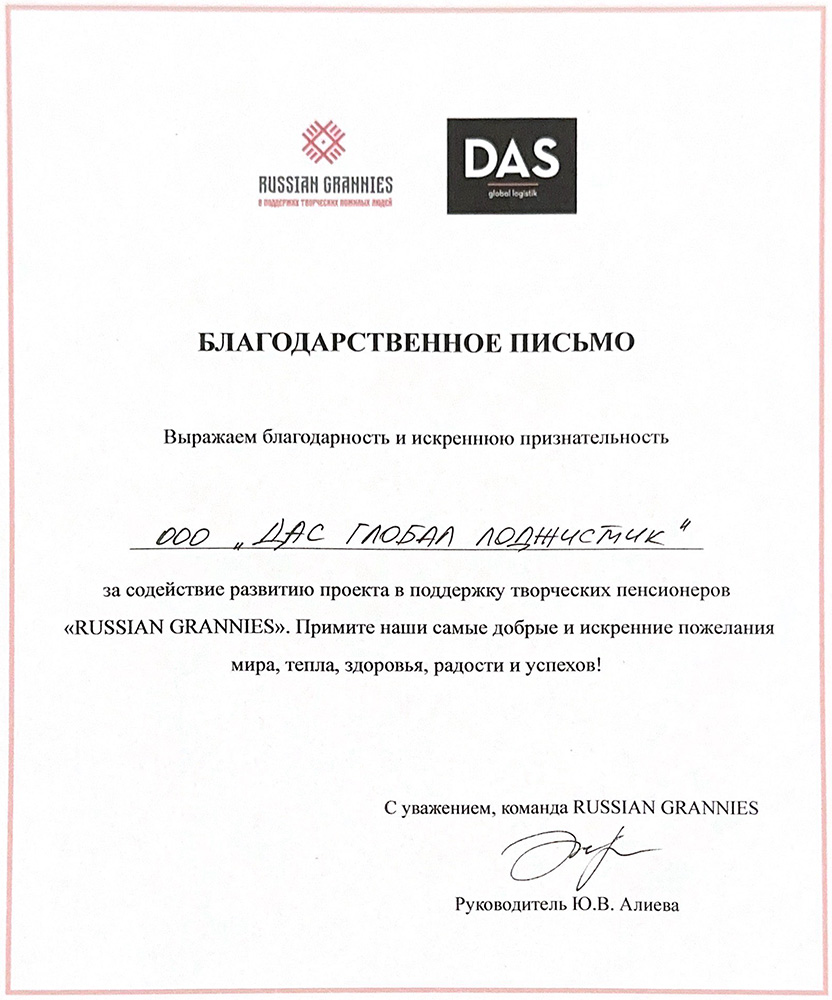 The social project “Russian Grannies” has existed since 2018, and we are glad that DAS GLOBAL LOGISTIK contributed to the development of such an important project, and you will also follow our example.