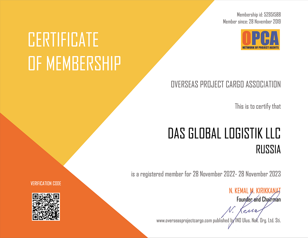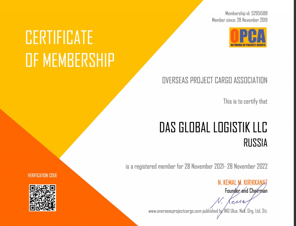 • Certificate confirming membership in OPCA for project cargoes for 2022.