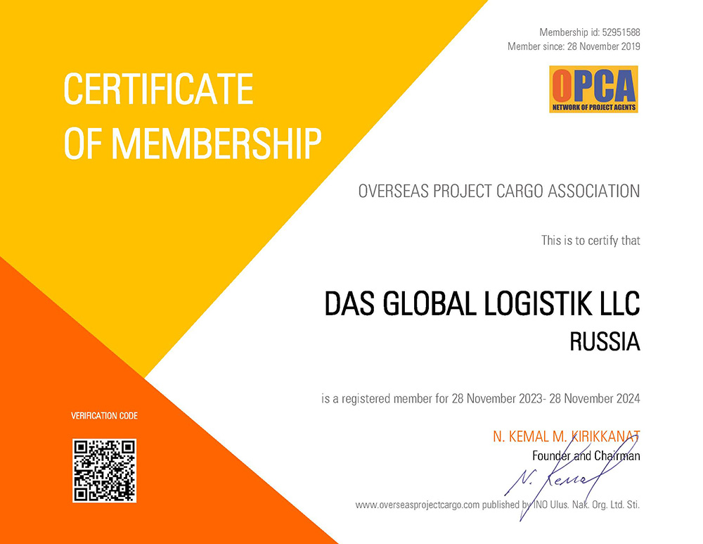 • Certificate confirming membership in OPCA for project cargoes for 2023.