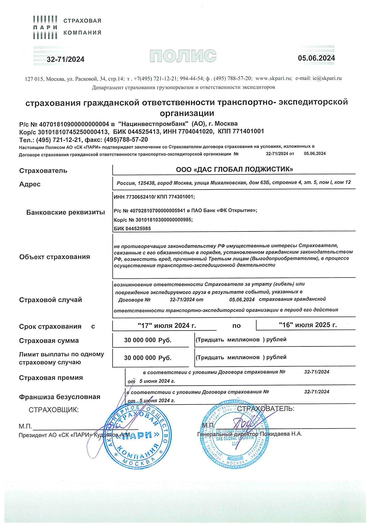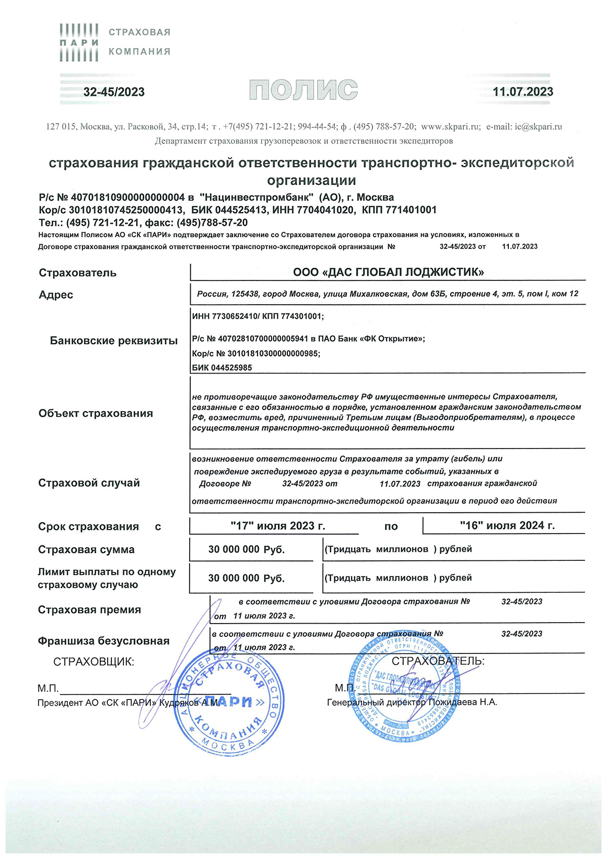 Insurance Company JSC IC PARI Policy No. 32-45/2023