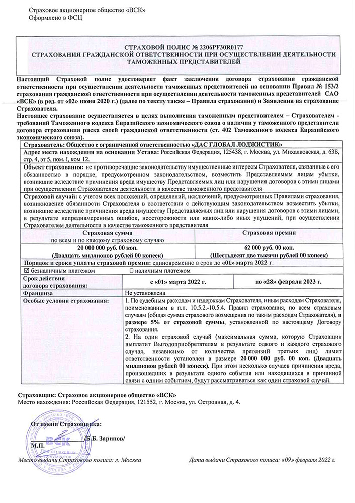 DAS GLOBAL LOGISTIK as a customs broker has its public liability insured by the OAO VSK for RUB 20,000,000 (per each event insured against)..