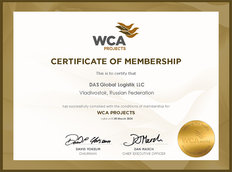 • WCA PROJECTS certificate confirming membership in the WCA PROJECTS international association for project and oversized cargo for 2022.